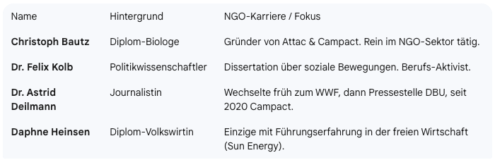 NameHintergrundNGO-KarriereChristoph BautzDiplom-BiologeGründer von Attac & Campact. Rein im NGO-Sektor tätig.Dr. Felix KolbPolitikwissenschaftlerDissertation über soziale Bewegungen. Berufs-Aktivist.Dr. Astrid DeilmannJournalistinWechselte früh zum WWF und dann zur Campact-Spitze.Daphne HeinsenDiplom-VolkswirtinDie einzige mit Führungserfahrung in der freien Wirtschaft.